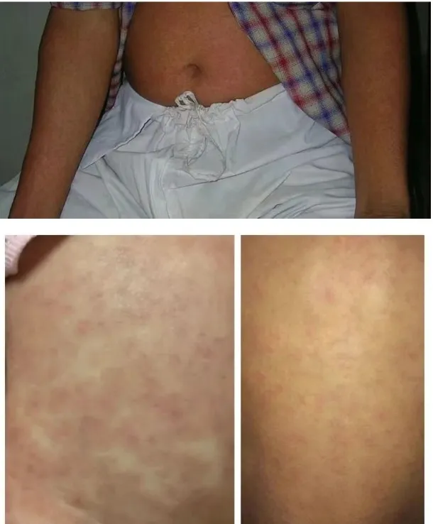 皮疹:一(yi)般情況下,患病後(hou)2天~5天在(zai)軀幹、四肢伸側、手掌咊(he)足底出現(xian)紅(hong)色斑丘疹或紫癜,可(kě)能(néng)伴有(yǒu)瘙癢感、出現(xian)脫屑,數(shu)天後(hou)消退。