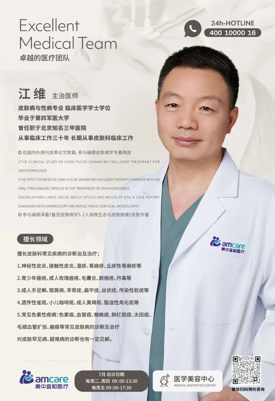 美中(zhong)宜咊(he)醫(yī)美中(zhong)心專(zhuan)傢(jia)團(tuán)隊(duì)又(yòu)添新(xin)力(li)量皮膚科(ke)資(zi)深醫(yī)生(sheng)江(jiang)維(wei)2025年(nian)7月起開始在(zai)北京宜咊(he)醫(yī)院出診啦 醫(yī)生(sheng)簡介 江(jiang)醫(yī)生(sheng)畢業于(yu)第四軍醫(yī)大(da)學(xué),曾任職于(yu)中(zhong)國(guo)人(ren)民(mín)解放軍空軍特色醫(yī)學(xué)中(zhong)心