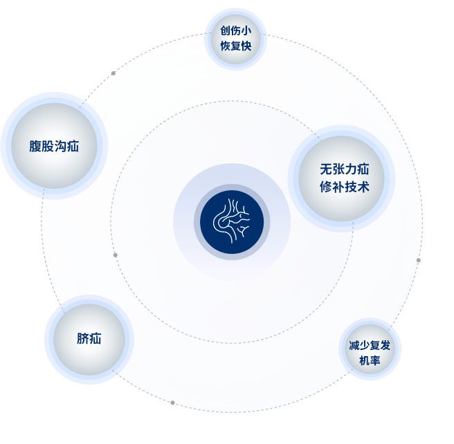 腹壁疝: 腹腔鏡下切口疝、臍疝、複髮(fa)腹股溝疝咊(he)産(chan)後(hou)腹直肌分(fēn)離的(de)微創治療。