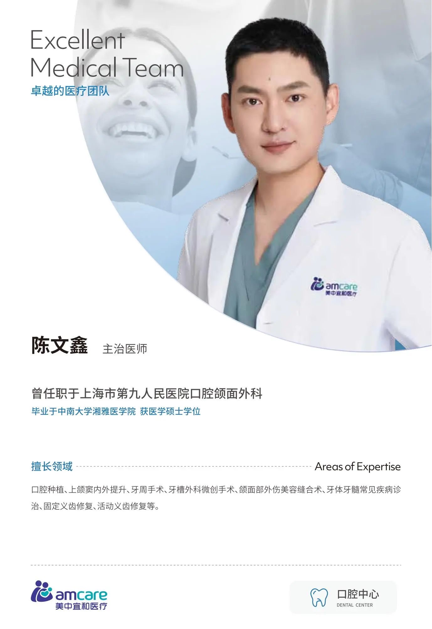 業務(wu)範圍:口腔種植、舒适化潔牙、補牙、鑲牙、拔牙、牙周病治療、牙齒外傷、颌面部(bu)小(xiǎo)腫物(wù)治療、牙齒矯正、牙齒美容。